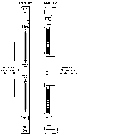 The V.35/RS-449/X.21 low-speed access card (LSAC) operates in conjunction with the low-speed line card. Figure 2-17 shows front and rear views of the low-speed access card.