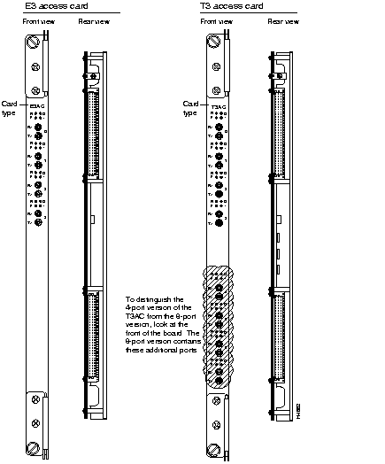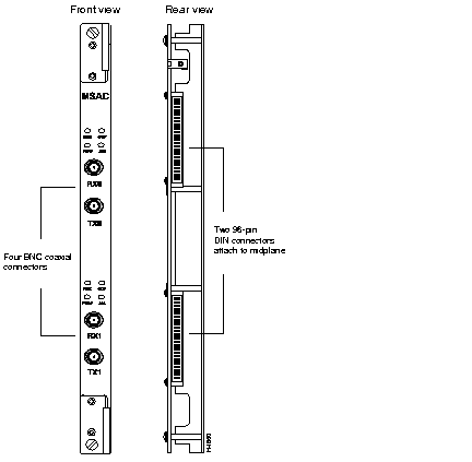 T3 medium-speed access cards (which are labeled MSAC) operate in conjunction with medium-speed line cards. T3 MSACs support up to two ports each. Figure 2-19 shows front and rear views of an MSAC.
