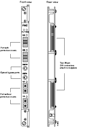 The FDDI access card (FAC) operates in conjunction with a packet line card. It allows the LS2020 node to connect to any network compliant with the ANSI standards for FDDI. Figure 2-11 shows front and rear views of the FDDI access card.