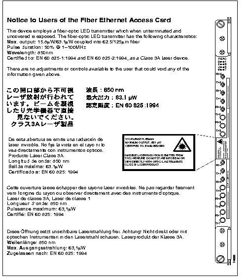 ![]() | Warning Unterminated optical connectors may emit radiation. Do not view them with an optical instrument. The transmit laser can damage your eyes. Be sure to read the information contained in Figure 2-10. |