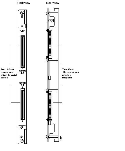 The serial access card (SAC) operates in conjunction with the packet line card. It supports up to eight full-duplex serial I/O ports that can be Frame Forwarding ports, Frame Relay ports, or a combination of the two. To accommodate those ports, the card has two 100-pin connectors. These connectors can be attached to interface-specific fantails (V.35, RS-449, or X.21) that hold the connectors for the I/O ports.