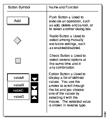 Buttons are used to provide a quick way to perform commands or select an attribute setting. If a button is not available for use, it is shown in gray. (All button types are defined by OSF/Motif.) Figure 1-3 describes the various types of buttons used in the configurator.