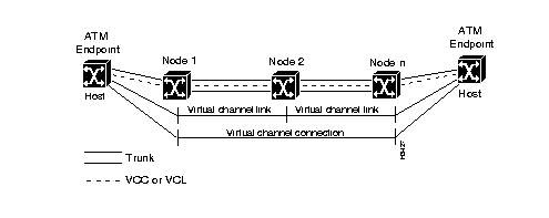 A virtual channel connection (VCC) is a series of virtual channel links (VCLs) between two ATM points. A VCL is a means of bidirectional transport of ATM cells between a point where a virtual channel identifier (VCI) value is assigned and the point where that value is either reassigned or terminated. The VCI identifies the VCL to which a cell belongs and determines where the cell should go next. Figure 1-6. shows the relationship between VCLs and VCCs in an ATM network.