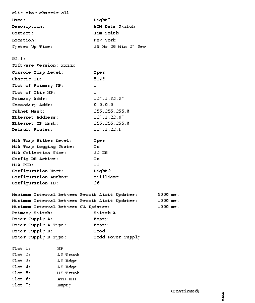 cli> show chassis agent MMA Trap filter Level: Oper MMA Trap Logging State: On MMA Collection Size: 32 KB Config DB Active: On MMA PID: 11 Configuration Host: boston Configuration Author: Bob Williams Configuration ID: 26 cli>