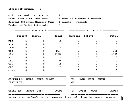 The DS3 MIB maintains these counters over a 24-hour period in 15-minute intervals. The Total column in the display includes up to 96 complete intervals. The Current column includes all counts that will make up the next complete interval. The Intrvl column shows the selected complete interval (from 1 to 96), depending on the actual number of complete intervals. The values that change are updated once per second.