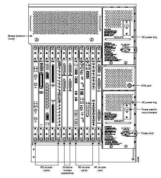 From the front of the LightStream 2020 chassis, you have access to network processor cards, line cards, switch cards, disk drive units, and one of the two blowers. Power supplies, access cards, external cabling, connectors for consoles and modems, and the other blower are accessible from the rear of the chassis.