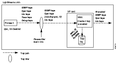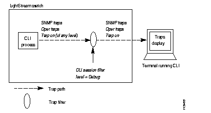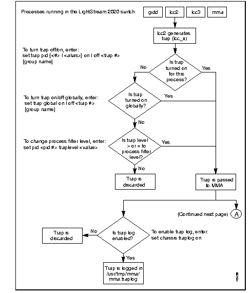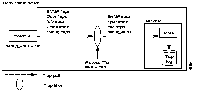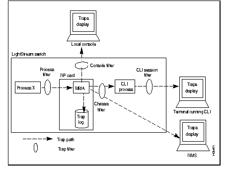 Figure 2-1, Figure 2-2, and Figure 2-3 show how traps flow through the LightStream 2020 node. They also show the CLI commands that you can use to affect the flow of traps. Each of these commands is explained in more detail within this chapter.