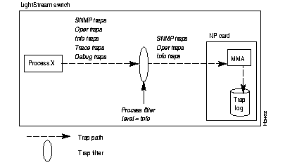 The trap(s) that you have turned on pass to the MMA whenever that trap is generated in the selected process. Traps that are turned off pass to the MMA only if they have an equal or higher severity level than the process filter.