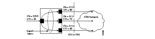 In Figure 6-4, cells entering the switch at the root point (on the left side at interface 0/0/0, VPI=50, VCI=100), are duplicated and switched to the leaf points (output interfaces), on the right side of the example.