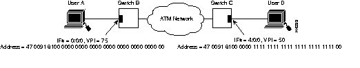 The following example allows User A to determine the destination ATM address of the interface connected to User D: