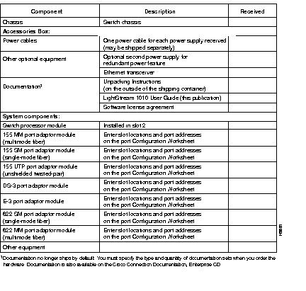 The Switch Component Checklist in Figure B-2 is used to verify that all hardware and documentation items needed to complete this installation have been received before starting the installation process.