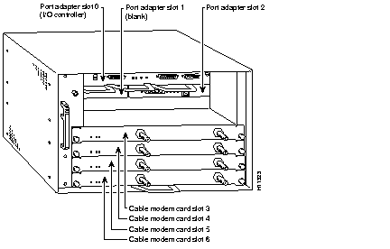 In Figure 1 and Figure 2, a blank port adapter is installed in slot 1. To ensure adequate airflow across the port adapters and cable modem cards, each port adapter slot must be filled with a port adapter or a blank port adapter, and each cable modem card slot must be filled with a cable modem card or a blank cable modem card.