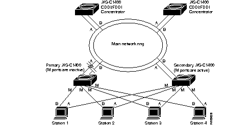 Module-priority attachment mode can be used to switch a primary WS-C1400 to a secondary WS-C1400 if the primary concentrator loses the main network ring connection due to the removal, disabling, or failure of Module 1. Figure 1 shows an example of a primary and secondary WS-C1400 configuration during a failover.