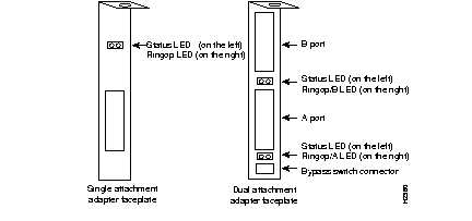 Each adapter has two LED indicators on the faceplate so that you can easily monitor the adapter's internal status and the FDDI link. Figure 1-5 shows single attachment and dual attachment FDDI EISA HP adapter faceplates, including the LEDs.