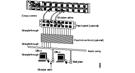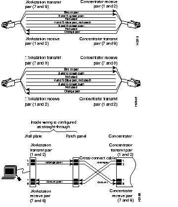 Figure E-4 shows the location of straight-through and cross-connect cabling for CDDI installations. Note that the cross-connect cabling is used between the concentrator and the patch panel.