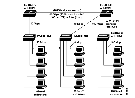 FastHubs A and B each contain a BMM and can be linked with a 100BaseT connection either at a distance of 100 meters (using UTP) or 2 kilometers (using full-duplex fiber-optic cabling). FastHubs A and B also connect to 10BaseT environments and can support 100BaseT nodes (not shown). FastHubs B and C are cascaded (to a maximum of 23 meters) by using the 100BaseT uplink port.