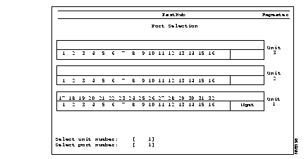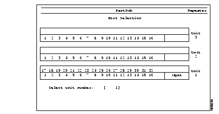 The Port Selection menu and Repeater Port Statistics report reflect the actual physical positions of the ports in each unit. The base configuration ports are numbered from 1 to 16, left to right. If a 100BaseTX/16 port expansion module is installed, its ports are numbered from 17 to 32, left to right.