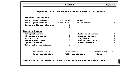 Use the Bridge Port Statistics Report selection to display port statistics for individual units. The Bridge Port Statistics Report presents frame transmit and receive statistics. You cannot modify any parameters through this report.
