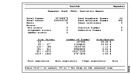 When you select the Bridge Port Statistics Report, the Bridge Port Selection menu is displayed (see Figure 3-24). After you select a unit number and a port number, the Bridge Port Statistics Report is displayed. For example, if you select port B on unit 1, the Bridge Port Statistics Report is displayed (see Figure 3-28).