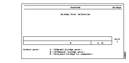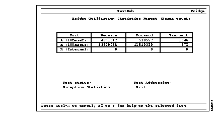 The Bridge Port Selection menu and Bridge Port Statistics Report reflect the physical positions of the BMM ports. BMM ports are identified from left to right as port A (10BaseT) and port B (100BaseT).