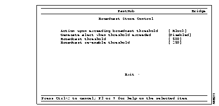 Action upon exceeding broadcast threshold--Define the action to take when the number of broadcast packets reaches the broadcast threshold. The bridge can block or ignore the broadcast storm. During blocking, the bridge drops all broadcast packets received from a port when the rate of broadcast packets exceeds the broadcast threshold. The bridge begins forwarding again when the rate of broadcast packets received drops below the re-enable threshold. The broadcast rate is measured by the number of broadcast packets received from a port in 1 second.