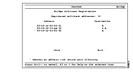Register a multicast--Register or replace a multicast address. You are prompted for the multicast address to register and the list of ports where frames destined for the registered address are forwarded. Enter the address using six hexadecimal octets, in the format hh hh hh hh hh hh.