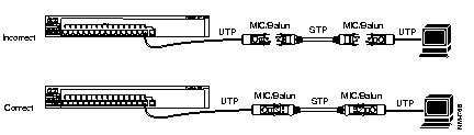 To prevent loopback problems when using STP cabling in a Token Ring network environment, make sure the MICs and baluns are never left unconnected when they are part of a link connected to the FastHub (see Figure 3-10).