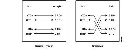 The shell for each connector is attached to the chassis ground. The 100BaseTX ports have their transmit (TD) and receive (RD) pairs internally crossed for attachment to an adapter using a Category 5 UTP straight-through cable. Straight-through and crossover cable schematics are shown in Figure B-2.
