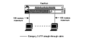 The maximum Cat 5 UTP cable segment length is 100 meters. When stations are connected to the FastHubs with 100-meter Cat 5 UTP cable segments, the Cat 5 UTP cable connecting the two FastHubs is limited to a distance of 23 meters, as illustrated in Figure 3-3.