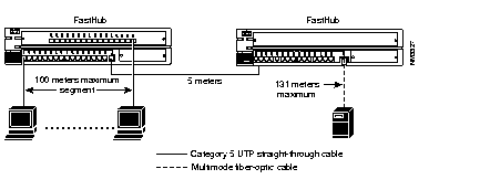 If all of the Cat 5 UTP cable segments connecting stations to one or both of the FastHubs are less than 100 meters, the length of the Cat 5 UTP cable segment connecting the two FastHubs can be increased. See the "Extended and Multivendor Configurations" section for more information.