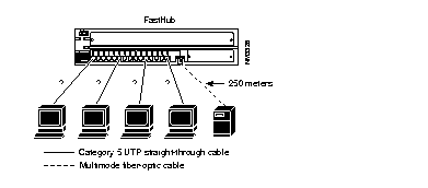 If all of the Cat 5 UTP-cable segments connected to the FastHub are less than 100 meters, the length of the fiber cable segment can be increased. See the "Extended and Multivendor Configurations" section for more information.