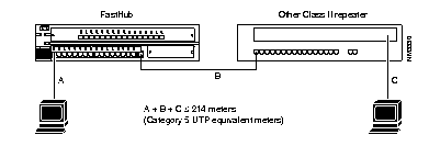 It is possible to increase the distance between two FastHubs by reducing the maximum cable segments connecting stations to the FastHubs. Using Table 3-1, we see that the maximum Cat 5 UTP equivalent distance between any two stations separated by two FastHubs is 223 meters.