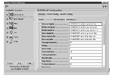 The DHCP/BootP server reloads the DHCP and BootP databases when it starts. Depending on how you configure your DHCP entries and the dnm-mode parameter, the DHCP/BootP server may also update your DNM server. A Restart button replaces the Start button.