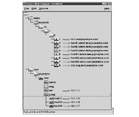 Step 4 Verify that the zone data has been loaded by starting the DNM Browser. Double-click the .com domain and you should see that yoyodyne.com has been loaded. You can browse the rest of the domains to verify that all of the zone files have been loaded.