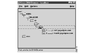 Step 15 In the DNM Browser main window, double-click "com," then "yoyodyne," then "dynamic." The "dynamic" domain now includes the domain names of any DHCP clients that have obtained leases from the DHCP/BootP server.