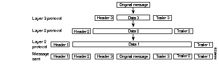 These wrapped messages are then passed into the layer below along with additional control information, some of which may be forwarded or derived from the higher layer. By the time a message exits the system on a physical link (such as a wire), the original message is enveloped in multiple, nested wrappers--one for each layer of protocol through which the data passed. When a protocol uses headers or trailers to package the data from another protocol, the process is called encapsulation. This process is illustrated in Figure A-3.