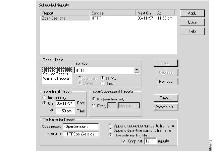Because the Reporting Subsystem provides statistical and summary information about the audit events that occurs, how you define your monitoring settings affects the details of the many reports that you can generate about the operation of the security system or a specific network service. Once you have defined the monitoring settings, you can specify which reports you want to generate on a periodic basis. At any time, you can generate a report on-demand; however, scheduled reports can provide timely information about the security system or a specific network service. For example, you can schedule reports that provide a summary of the network traffic activity once every minute, hour, day, week, month, year, or any number of these periods. You can schedule three basic categories of reports: