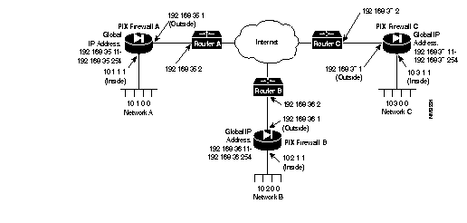 For this example, assume that PIX Firewall B, the version 2 PIX Firewall, is already configured to have the IP addresses and global IP addresses shown in the illustration, and that it has its Private Link configured to talk to PIX Firewall A and C. Refer to the version 2 Private Internet Exchange Reference Guide (Document Number 78-3362-02) for more information on configuring Private Link.