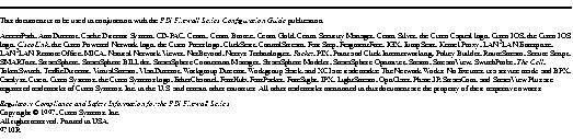 This document provides regulatory compliance and safety information for the PIX Firewall and the PIX10000 products. Refer to the other documentation supplied with your unit for additional safety information.