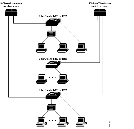 EtherSwitch 1420s and 1220s can connect to a 100BaseT backbone switch or router, as shown in Figure 2-4. With support for full-duplex operation, each 100BaseT link supports up to 200 Mbps of bandwidth and fiber-optic cabling distances of up to 2 kilometers.