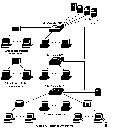 Multiple EtherSwitch 1420s or 1220s can be connected via shared 100BaseT using a multiport repeater in an EtherSwitch 1420. More high-speed server connections can be added by using additional EtherSwitch 1420 modules, as shown in Figure 2-3.