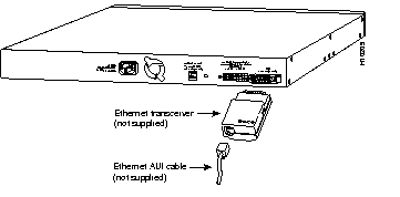 The AUI port on the switch can connect to an external transceiver for attachment to a thick coaxial, thin coaxial, or fiber-optic cable. You must provide the Ethernet AUI cable required to connect this port to the external transceiver.