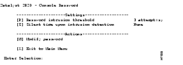 Display this menu, shown in Figure 5-3, by entering C on the Main Menu. Use it to change your password, set the number of password intrusions allowed, and define how long the management console remains silent after an intrusion.