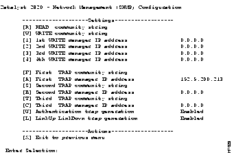 You can use this menu (shown in Figure 5-8) to enable two traps and assign the management stations to receive them. Once a management station has been assigned, it receives all traps issued by the switch, as documented in the "Trap Clients and Traps" section in the "In-Band Management" chapter. All objects in the Catalyst 2820 and 1900 MIB are documented in the Catalyst 2820 Series and Catalyst 1900 Series MIB Reference Manual.