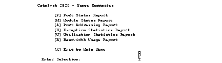 This report displays the frame-count statistics generated by the Catalyst 2820 and 1900. Display this report, shown in Figure 5-29, by pressing U on the Main Menu and U on the Usage Summary Menu.