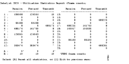 This section describes statistics generated by the Catalyst 2820 and 1900 Management Console. If you are using VT100 terminal emulation, the screens displaying the statistics are refreshed every 5 seconds. If you are connected to the Management Console via a modem running at less than 2400 baud, the screens displaying the statistics are refreshed every 8 seconds.