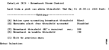 [B] Broadcast storm control. Select this option to display the Broadcast Storm Control Menu. You can use this menu to inhibit the forwarding of broadcast packets when large numbers or storms of them are received by a port.
