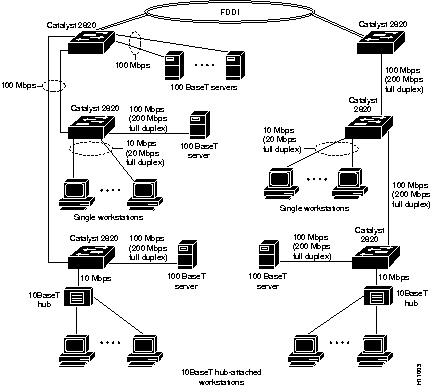 In Figure 1-8, two Catalyst 2820 switches, each equipped with a Catalyst 2820 Fiber DAS module, are connected to an FDDI network backbone. The Catalyst 2820 switch on the left is also configured with a Catalyst 2820 4-port 100BaseT repeater module, which connects to two other Catalyst 2820 switches and two servers via shared 100BaseT connections. (An 8-port 100BaseT repeater module is also available for the Catalyst 2820 switch.)