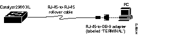 Use the thin, flat, RJ-45-to-RJ-45 rollover cable and RJ-45-to-DB-9 female DTE adapter to connect the console port to a PC running terminal emulation software. Figure B-5 shows how to connect the console port to a PC. Table B-1 lists the pinouts for the console port, the RJ-45-to-RJ-45 rollover cable, and the RJ-45-to-DB-9 female DTE adapter.