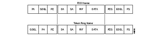 When bridging from Token Ring to FDDI networks, the Catalyst 1600 converts the frame format between IEEE 802.5 for Token Ring and ISO 9314 (with the addition of the routing information field) for FDDI, as follows: